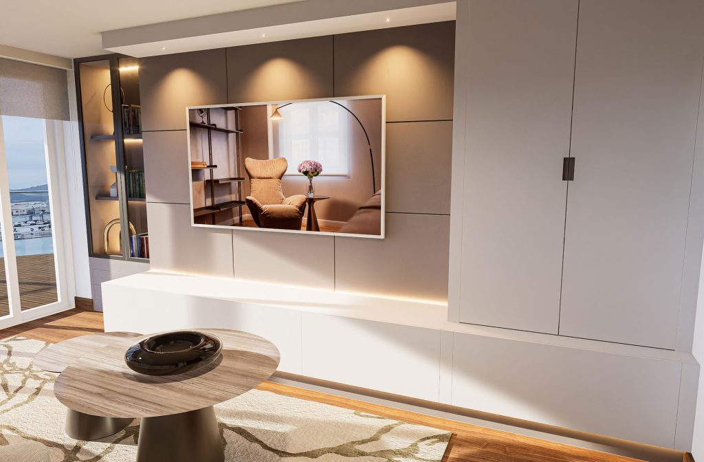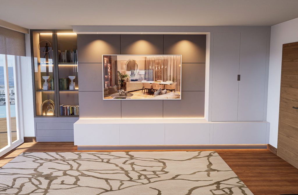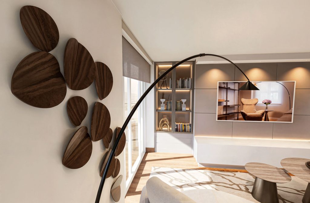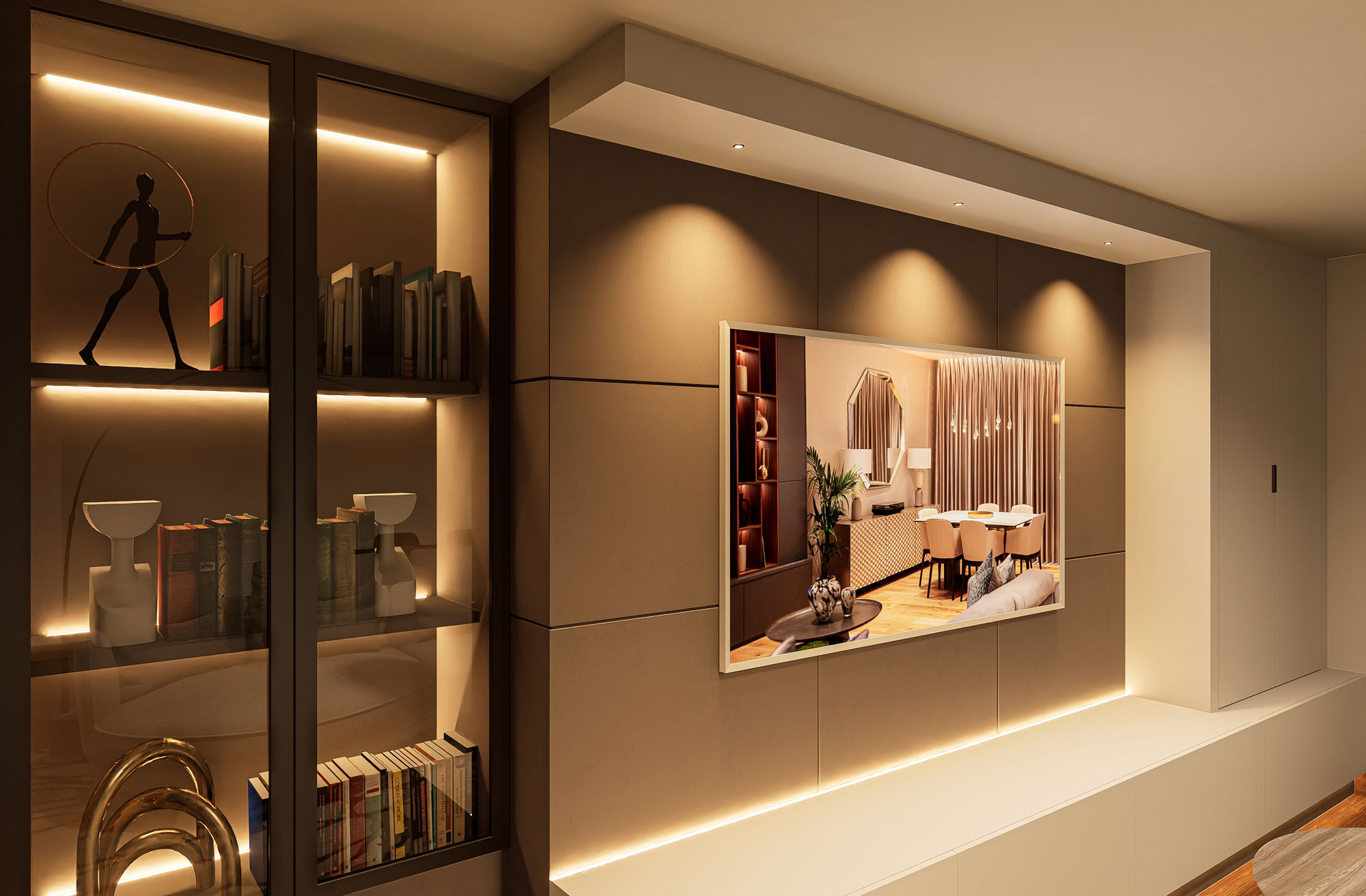 Step into a living space where modern sophistication embraces warmth and functionality. This lounge area is thoughtfully designed with soft, organic forms and a neutral palette, creating an inviting atmosphere for relaxation and social gatherings. Custom cabinetry, integrated lighting, and elegant textures blend seamlessly to enhance both aesthetics and practicality. The open layout, accentuated by natural light and curated decor, offers a harmonious balance between comfort and refined style. Every detail is considered to elevate the everyday, making this interior a perfect reflection of contemporary elegance and effortless living.