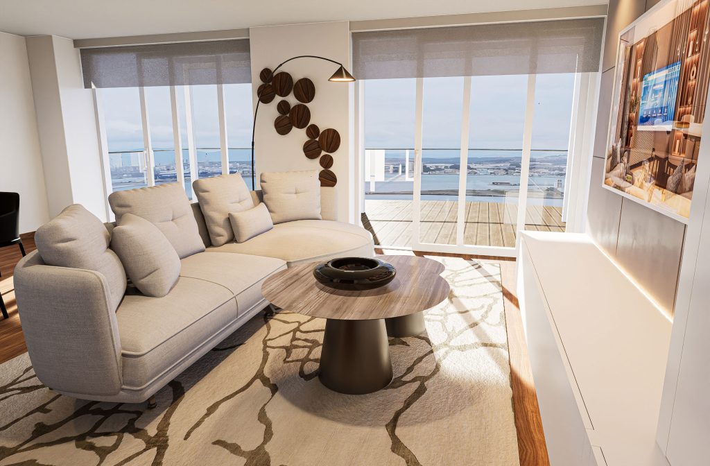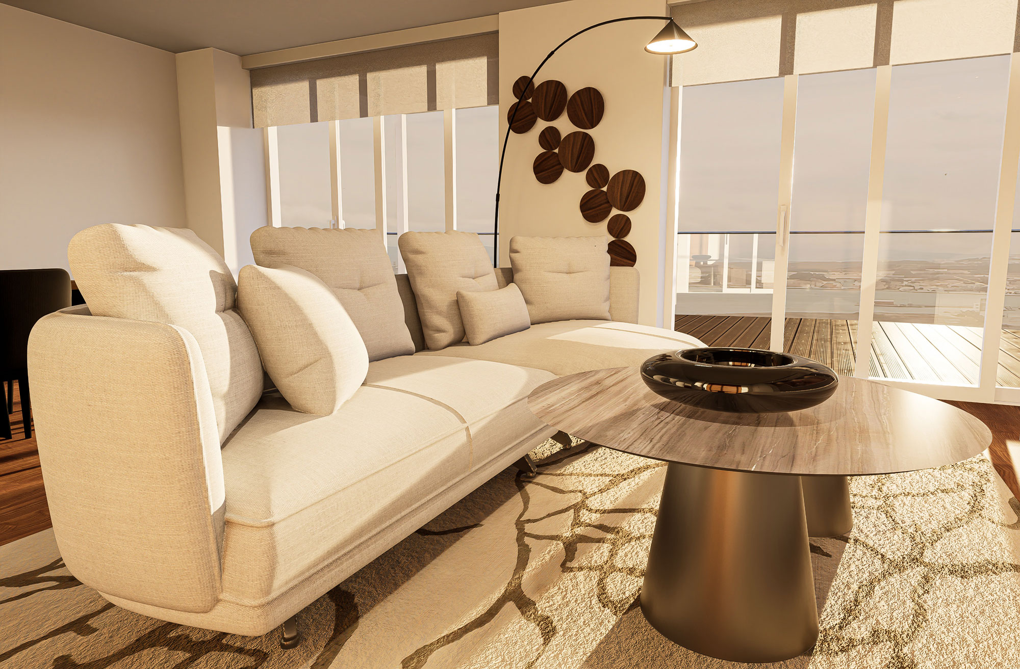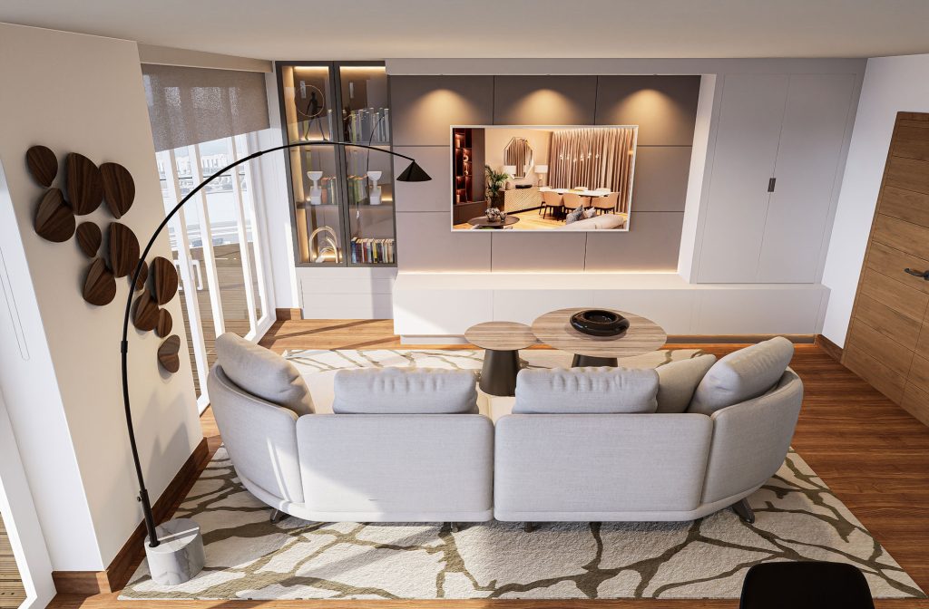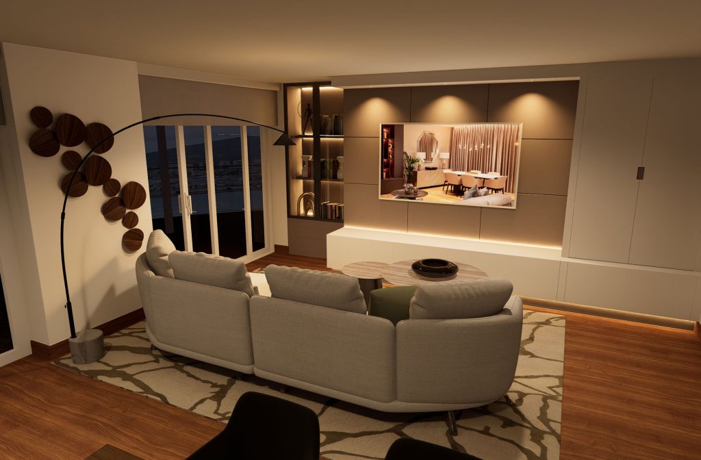 Step into a living space where modern sophistication embraces warmth and functionality. This lounge area is thoughtfully designed with soft, organic forms and a neutral palette, creating an inviting atmosphere for relaxation and social gatherings. Custom cabinetry, integrated lighting, and elegant textures blend seamlessly to enhance both aesthetics and practicality. The open layout, accentuated by natural light and curated decor, offers a harmonious balance between comfort and refined style. Every detail is considered to elevate the everyday, making this interior a perfect reflection of contemporary elegance and effortless living.