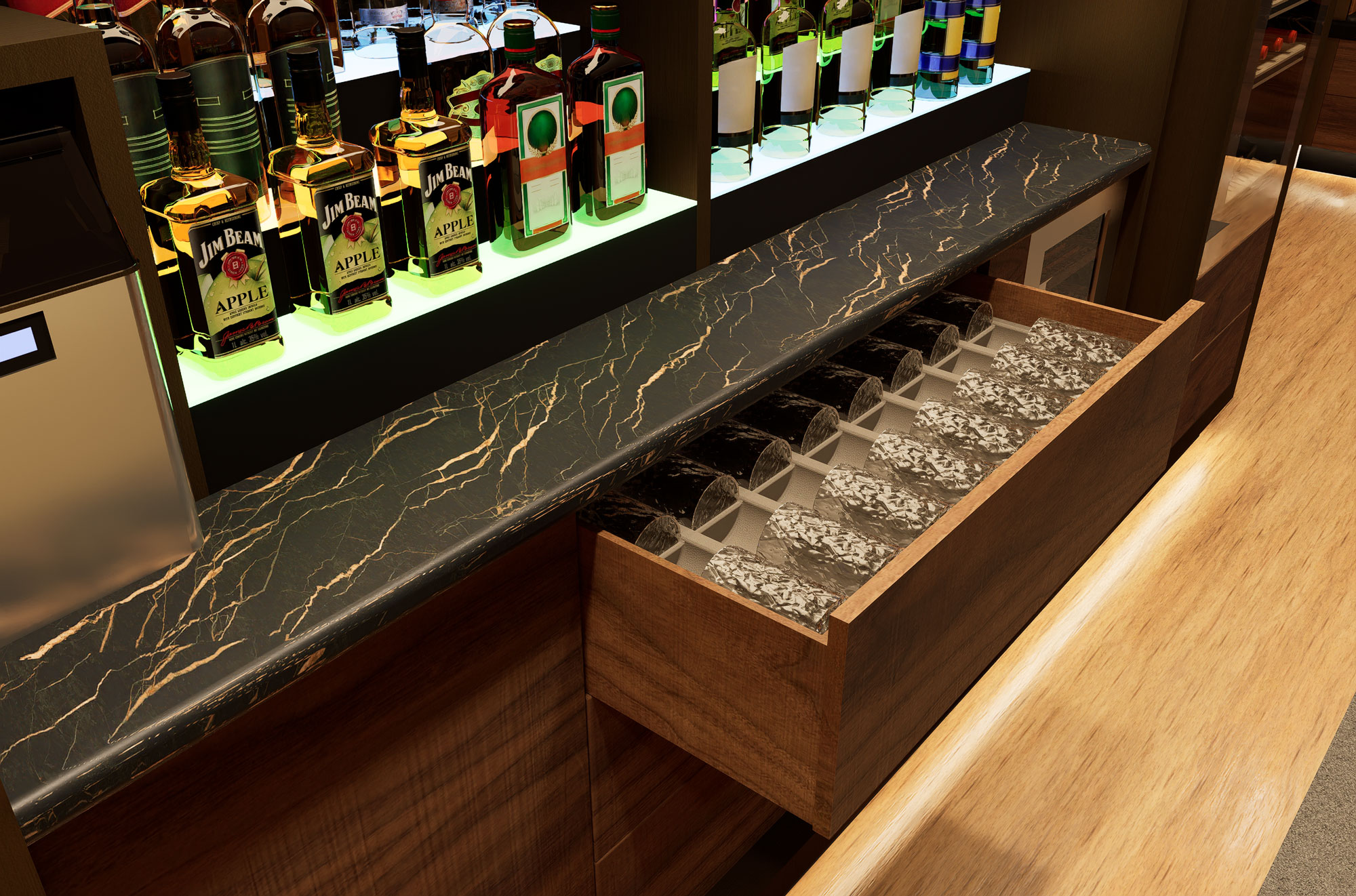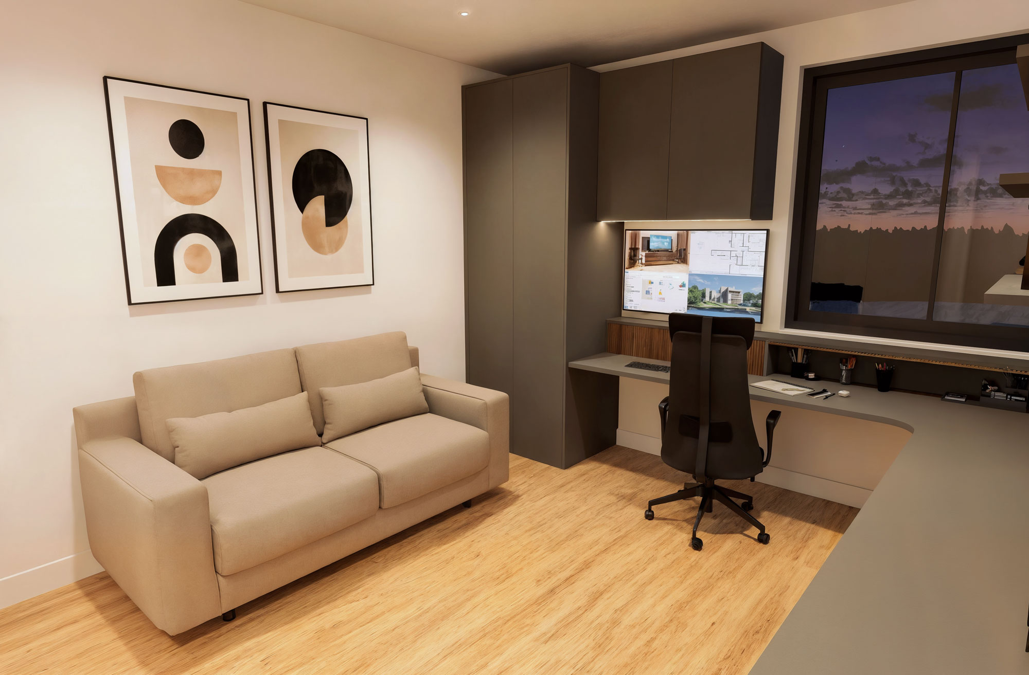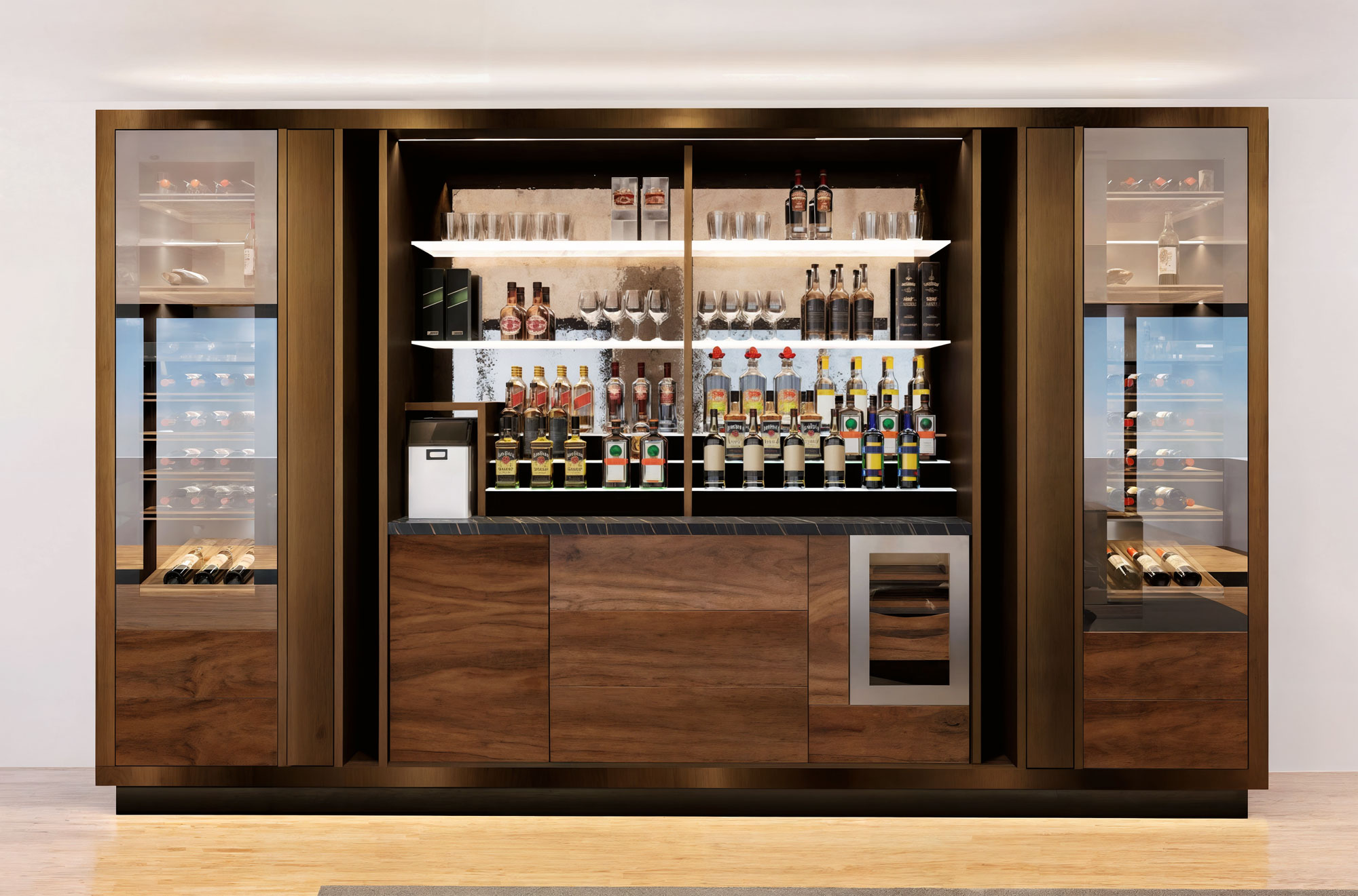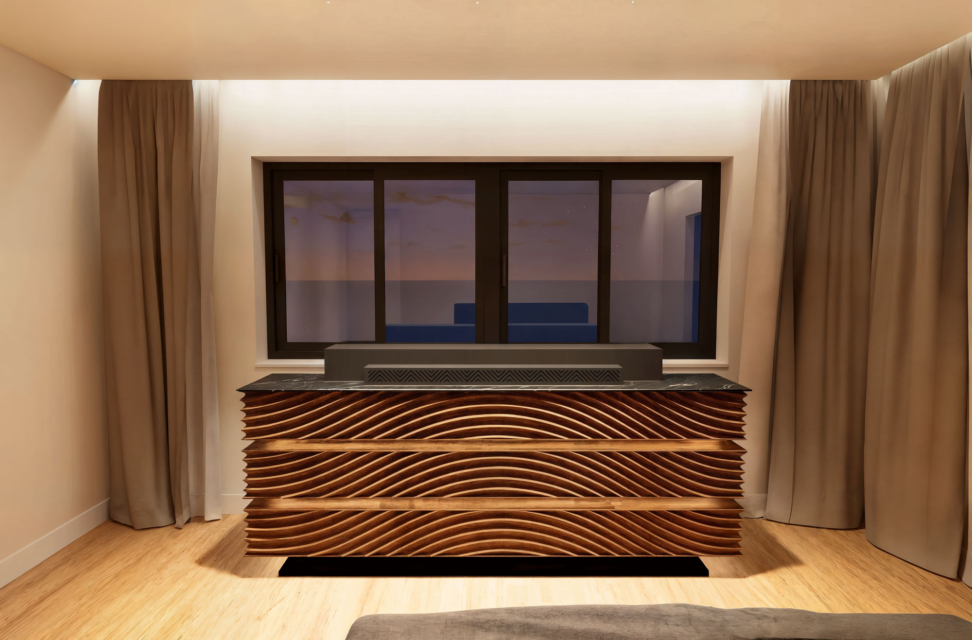 This bespoke high-end furniture project showcases exceptional craftsmanship and materiality, featuring brushed bronze, crown cut American walnut, and natural stone throughout. Every piece was custom-designed and tailored to the client’s space, with seamless integration of indirect lighting to enhance warmth and depth. The collection includes a striking bar cabinet, a statement unit for the market’s largest OLED TV, and a home office that can be discreetly concealed for a clean, refined look. A motorised TV cabinet and two matching bedside tables complete the ensemble, marrying function with understated luxury in a cohesive, contemporary aesthetic.